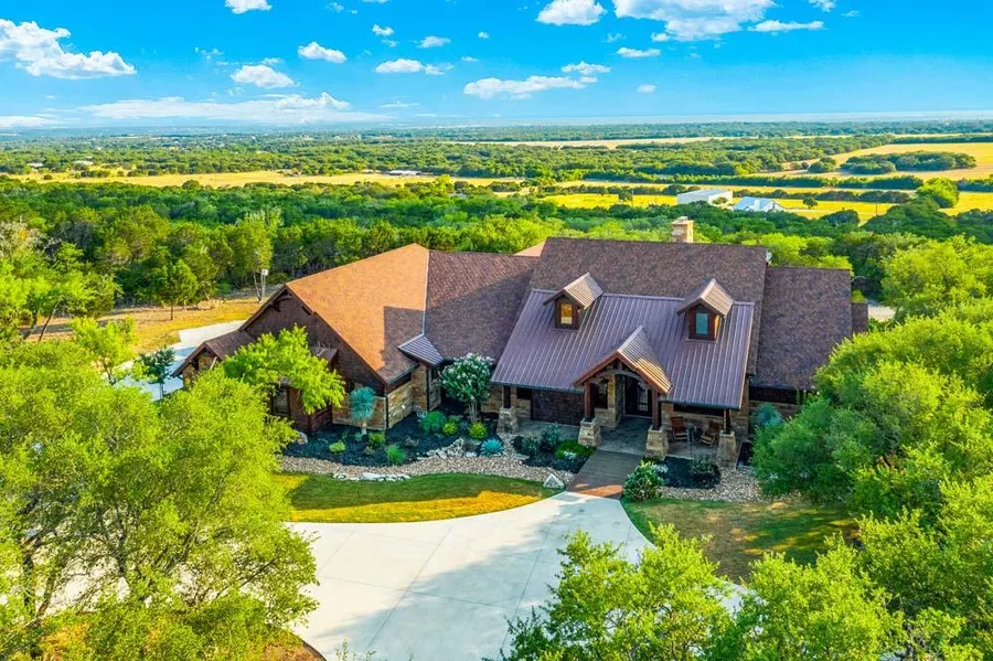 Panoramic Hill Country vistas from the home and the outdoor living area with ultimate privacy on all sides in a small, exclusive, gated, 4-lot large acreage community. 40+ mile view at 1040 ft elevation. City lights of Marble Falls, Burnet, and Buchanan Dam are visible on a clear night.