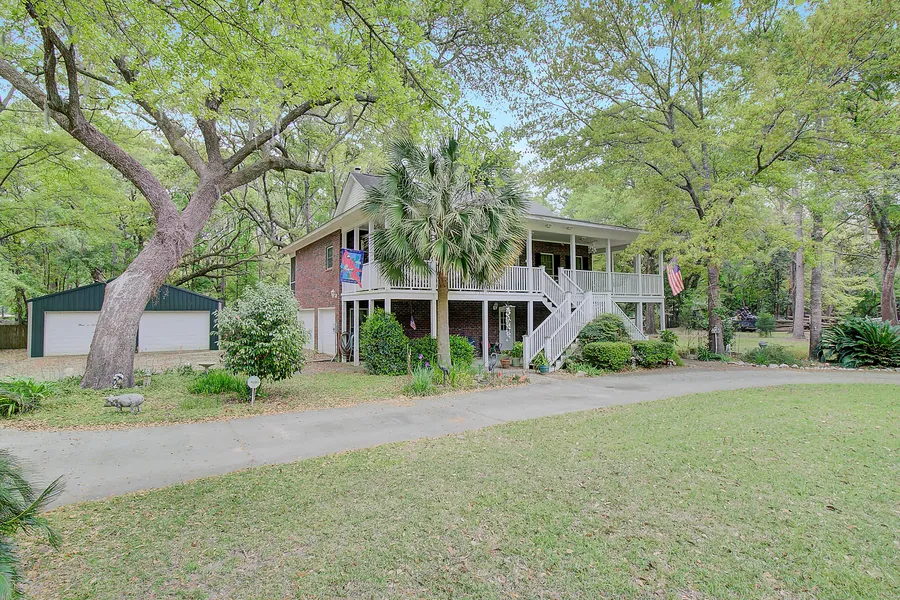 Welcome to your escape. NO HOA. This 3 bedroom 2-1/2 bath custom built, single owner, brick home is in an ideal location for some peace & quiet on an acre of closely mown land near the river. This sturdy elevated home in an X Flood Zone is set back on the acre with a convenient, long u-shaped drive leading to the huge 2 car garage & private office. If you have more cars or need more workspace there is a large separate outbuilding which was added & can be used as either a garage or a workshop. Up the stairs & onto the full length front porch &, then through the front door into the family room which has a cozy fireplace for the cooler months. Hardwood floors throughout the home & tile in the bathrooms. Master has private bath with a shower & a big walk in closet.The door off of the dining area next to the kitchen leads to a screened-in porch that looks onto the rear yard and patio. There is a lift on that porch so when you come home from shopping you can just elevate your groceries to the 2nd level without having to carry them up the steps. This home is located next to the Golf & Equestrian community of the Links at Stono Ferry where Golf & fitness memberships are available. There is easy access to highways, Folly Beach (22 Mi), Downtown Charleston (14.5 Mi). Costco (10 Mi), Publix (4.5 mi) & Charleston International Airport (16 Mi) This is a home that has it all covered.