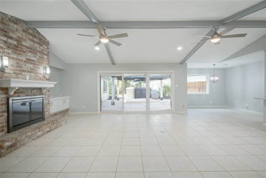 Modern upgrades meet timeless design in this warm and inviting home. From the foyer, the open layout flows seamlessly to the family room with its beamed, vaulted ceilings & striking brick fireplace flanked by built-ins alongside a wall of windows. Also off of the spacious entryway is the formal dining room with a contemporary chandelier. and ease of access to the kitchen. The updated kitchen shines with soft-close cabinetry, marble-look counters, glass tile backsplash, & SS appliances, opening to both the family room and breakfast area for easy entertaining. The privately situated primary bedroom features an upgraded ensuite bath with dual sinks, soaking tub, glass shower, and dual-entry walk-in closet. Secondary bedrooms enjoy access to an updated hall bath with a glass-enclosed tub/shower. Step outside to an entertainer's paradise with a large covered patio & Swim Spa. Home has PEX piping (2023), 2020 roof, no carpet, upgraded kitchen & primary bath, and a flexible floor plan.