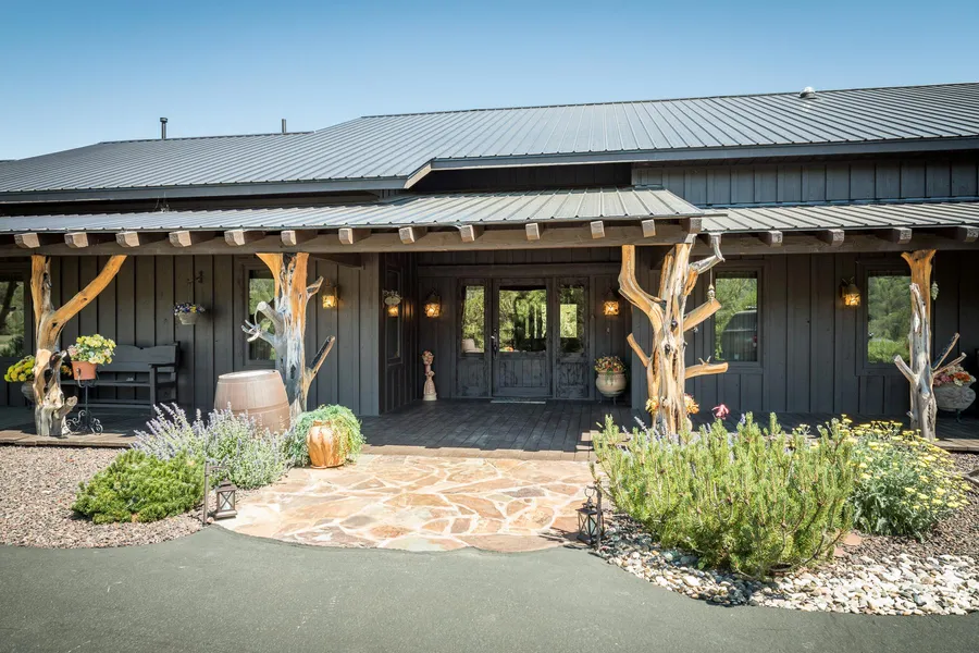Surely one of the most noteworthy and creative homes in Trappers Crossing, this dramatic one-level home of more than 3,933 SF boasts an array of expansive living and entertaining spaces with a large buffet and island in the kitchen and serene private areas, including a stunning master suite, and 2 guest suites. Artistic use has been made of Colorado flagstone, 5-inch plank hickory floors and Italian tiled and stained concrete countertops, creating lovely depth and texture. All of the major living spaces enjoy access to the covered decking that runs along the back and front of the home accented with reclaimed cedar pillars. Inside the home, Mexican hand-cut tin sconces create a lacy effect on the walls. Large circular stone walk-in showers, a large stone wall housing a gas starting wood fireplace, fantastic homestead style windows and double doors opening out to the deck all lend to the unique nature of this house. The home has in-floor heating, 8 ft. wide hallways, and 3 ft. wide doors. Custom height toilets and counters merge form with function to enable ease and comfort for your family and guests. In addition, there is an oversized 2-car garage with a large separate storage room. The lot presents a view of the rolling mountains in the distance. The acreage surrounding the home is a quintessentially peaceful Southwestern landscape of high desert, dotted with native pion, pine, and juniper.