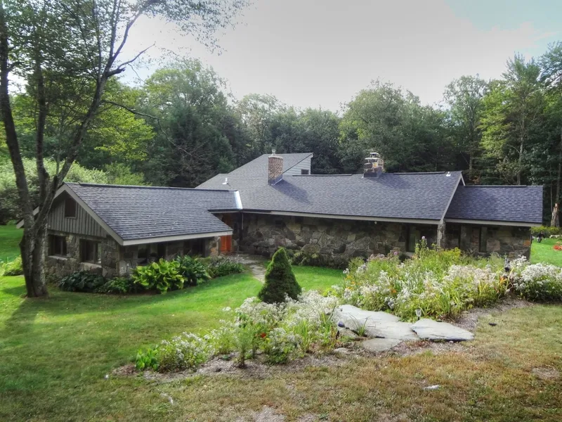 It's rare to find such a beautiful and private natural setting so close to Burlington! 33 acres to call your own with woods, wildlife, sunny perennial and vegetable gardens, stone walls, surrounding lawn and a small pond. This is a unique stone mason's home with a one-of-a-kind arched stone fireplace at its heart. Thick stone/block walls, wide pine flooring, wood trim & interesting accents throughout. The bright & efficient kitchen and adjacent dining area look out onto the blue stone patio, and the brick floored sunroom is a favorite spot to be year 'round. One bedroom has a loft and private bath with tiled shower & soapstone vanity, while the other is offset from the main house, with its own cozy gas stove and French door opening to deck. A sunny loft adds more versatile living space. The detached 2-car garage has stairs to a large 2nd story for storage & more. Woodland paths connect to adjacent trail networks - mountain biking, x-country skiing & snowshoeing. Truly an outdoor lover's paradise.