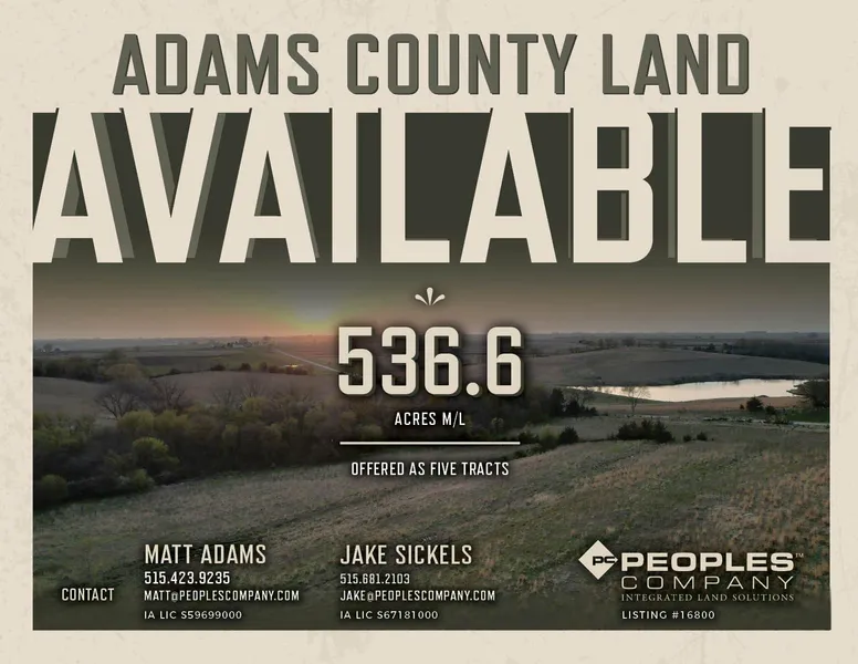 Peoples Company is pleased to offer a rare opportunity to purchase 536.6 acres m/l of Adams County combination farmland, located just west of Prescott, Iowa. Acquiring a portfolio of this caliber in one specific area often takes decades of hard work and effort. These tracts are offered as a turn-key unit or could be purchased individually in tracts ranging from 66.6 to 200 acres m/l. The farms include a wide variety of attributes and feature something desirable for any type of Buyer including but not limited to; well maintained CRP acres with annual payments totaling $62,506, productive row crop acres, heavily timbered draws, thick bedding cover for wildlife, a lake, multiple ponds, and pasture.