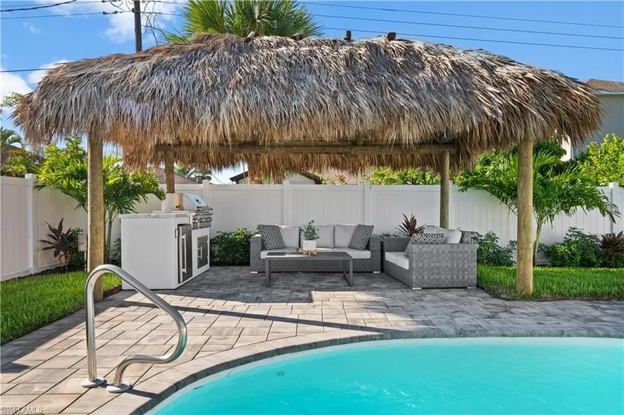 Outside, enjoy resort-style living with a saltwater pool surrounded by new pavers, complemented by an outdoor kitchen, a grill, and a charming chickee hut. The screened front porch is perfect for morning coffee or evening cocktails, while lush tropical landscaping, a manicured lawn, and new landscape lighting create a serene ambiance. With updates such as an epoxy-coated garage floor and a new irrigation system, this property is truly move-in ready.