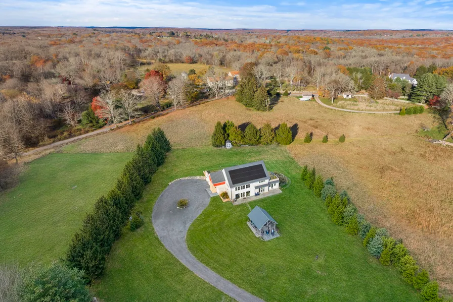 Discover a New-Generation Modern Farmhouse set on 7.3 pristine acres on one of the most coveted addresses in Historic Stonington. Once Colonial Farmland, now a Masterfully Designed Private Estate combining timeless character with cutting-edge performance. This 3 Bedroom 2 and 1/2 Bath home was thoughtfully constructed in 2019 to the highest Passive House, Net Zero Plus, and extreme weather-resilience standards. Enjoy a stunning First-Floor Primary Suite retreat with sauna and the spa-like heated-floor bath designed for two, walk-in closet, and glass doors opening to the patio, create a serene private sanctuary. Adjacent, a sun-filled exercise/recreation room and is ideal for a gym, studio, or indoor garden. The expansive open-concept living and dining space is anchored by soaring 30-foot post-and-beam ceilings and a striking gas fireplace, perfect for elegant entertaining and everyday comfort. The Chef's Kitchen is impeccably appointed with GE Wall oven, Sub-Zero refrigeration, Wolf induction cooktop, Miele commercial dishwasher, custom cabinetry, built-ins, and a Custom Island with Quartz Countertop. Outdoor living is equally extraordinary featuring a 20'x16' Post and Beam Pavilion, a 40' Bluestone Patio and also includes a Custom Rock-Enclosed Outdoor Shower. Infrastructure is already in place for a 40-foot lap pool, including electricals and equipment slab. Many Recent upgrades including professional landscaping.