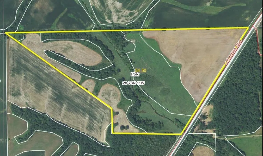 54.5 acres, m/l, with 43.65 FSA crop acres and CSR of 65.9 on FSA crop acres.