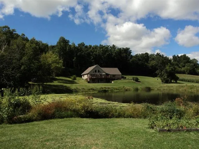 ACCEPTED OFFER! Outstanding setting! Nice home, built in 2000, overlooks a large pond with amazing views from the east facing wood deck. Home has 3 bedrooms, 2 baths, open concept, vaulted ceiling and loft. Home is heated with outdoor wood burner and radiant floor heating in the basement & garage. Backup heat provided by LP gas. 54.7 acres within city limits, mostly wooded, zoned ag. 11 tillable acres currently rented for annual income of $1,300