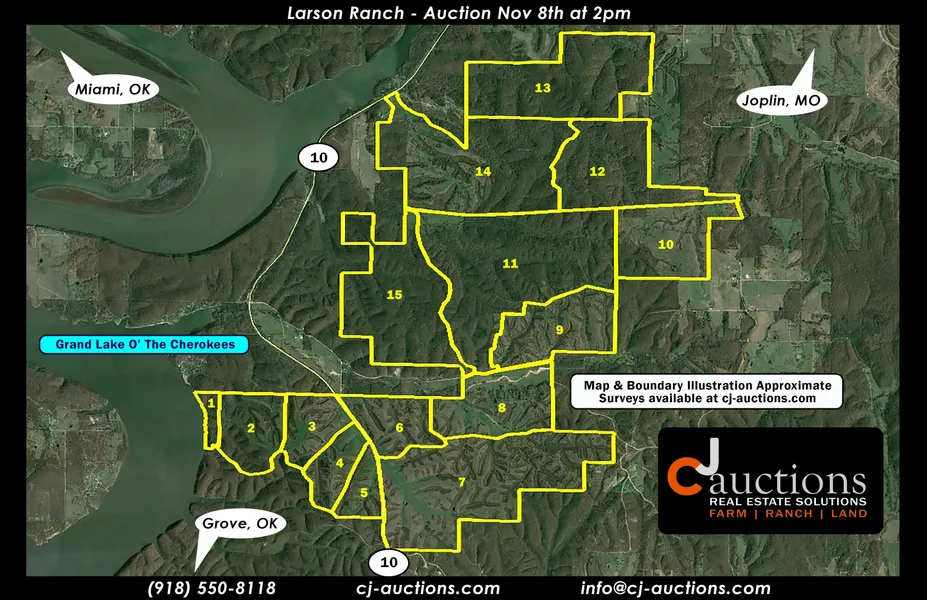 Unique opportunity to purchase part or all of the 5,400+/- ac Larson Ranch located 10-miles northeast of Grove fronting the eastern shores of Grand Lake. Access to I-44, Joplin Missouri and the Grand Lake recreational area are all within a short drive from the ranch.