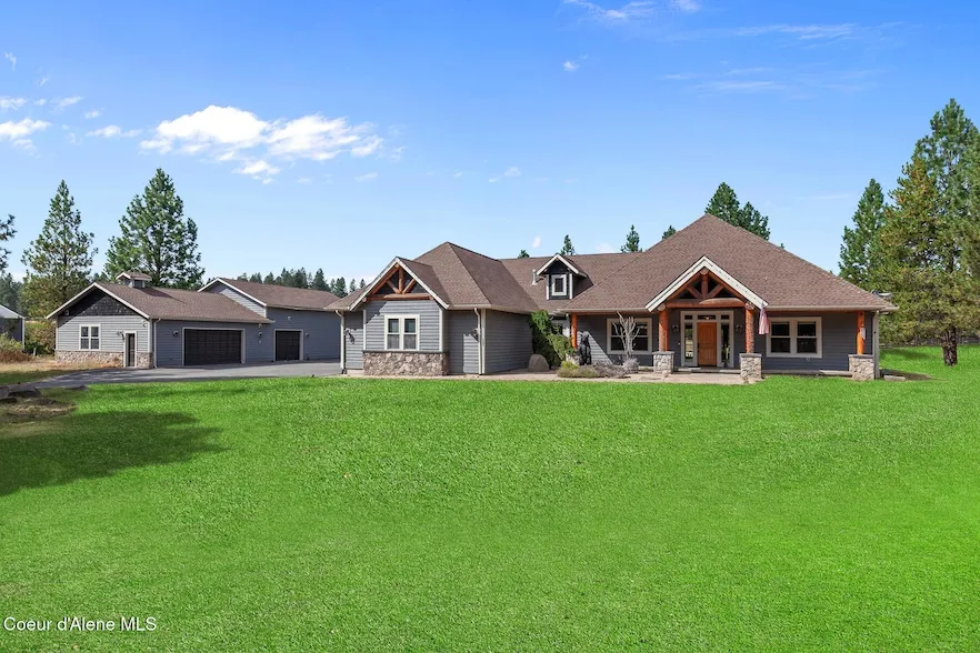Scenic Hayden setting near English Point, Hayden Lake, and Golf! Custom built home on nearly 5 acres with a 30x70 dream shop! Main floor living areas include a great room w/gas fireplace & built-in cabinetry, formal & informal dining rooms, gourmet kitchen w/ marble counters, large island and new Wolf appliances. Primary suite w/ensuite bath & gas fireplace plus 2 additional bedrooms, full bath, half bath, pantry & laundry room. The 2nd floor boasts a large family room with wet bar & additional full bath that could be a 2nd bedroom Suite. Large covered back patio with firepit, 3 car attached garage and paved driveway. Partially fenced, level meadow with water feature and mature landscaping surrounds the home. New whole house generator, furnace and heat pump plus many additional upgrades. This is the North Idaho dream!