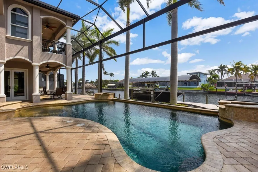 Paradise Villais the place for you. If you're looking for a vacation on the water, you'll find it at this home! The property sits on a canal that leads out to the Caloosahatchee River and Gulf of Mexico. Take the bikes or a 10 minute walk (0.6 miles) over to Cape Harbour where you can enjoy waterfront dining, shopping and entertainment. This grand home has plenty of room for your entire group to enjoy, especially if you're looking to relax poolside. The sprawling pool (and hot tub) are complemented by a gorgeous wide deck. Grill with a view of the canal, or just enjoy the view underneath the two-story lanai. Guests looking to bring their boat will love this home's incredible boat access - feel free to tie up on the boat dock! ?Inside, guests can cook up delicious meals in a luxurious kitchen outfitted with a French door refrigerator, double oven, and special prep island with an extra sink. The home's private office is perfect for remote work or schooling. You'll have your pick of places to relax throughout this breezy home. The bedrooms of this home are all spread out, so you'll have your pick of great views. Turn right while in the downstairs living room to find the first bedroom, all set up with a private pool deck entrance and an en suite bathroom that features double sinks, a standalone shower, and a soaking tub. Climb the stairs and turn right to reach the home's luxurious second bedroom. In addition to a gorgeous multi-window view of the canal, this room features an en suite bathroom with double sinks, a shower/tub combination, and a hallway entrance. Head down the catwalk-style hallway and turn right to reach the home's main bedroom - you'll be thrilled with this room's gorgeous private furnished balcony, extra seating, and spacious en suite bathroom with two vanities, jetted tub, and stone stand alone shower. The fourth bedroom is set up for guests that want to bunk together - in addition to two beds, this room has a two-window view of the front yard. The fifth and final bedroom is ideal for younger guests. Every bedroom includes a ceiling fan in addition to home-wide central air conditioning. Beach towels and six adult bikes are available for guest use. There are also age-appropriate games for the younger guests. Pool heat is available for $25/day or at a reduced monthly rate but is only needed Oct to May. Commercial vehicles and boat trailers are not allowed to park overnight per city rule. The dock is available for guests to tie up a boat (the lift is not available for guest use). The dock can fit up to a 50 ft boat. Ropes or equipment are not available for guest use. The water depth in the canal is 10 feet deep - swimming is not recommended due to canal width. One dog, weighing 30lbs or less, is welcome in this home for a fee of $150. Garage is not available.