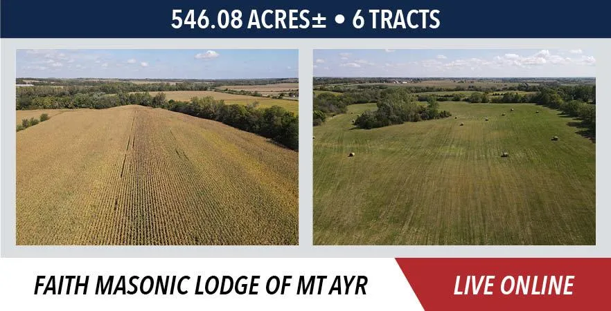 The Faith Masonic Lodge of Mt. Ayr Farms will be sold on a price per acre basis, based on Taxable Acres. All 6 tracts will be offered through the marketing method of Buyers Choice, whereas the high bidder can elect any or all tracts for their high bid. If the high bidder does not elect all tracts, then the remaining tracts will then be offered through the marketing method of Buyers Choice until all tracts are sold. The tracts will NOT be offered in their entirety at the conclusion of the auction.