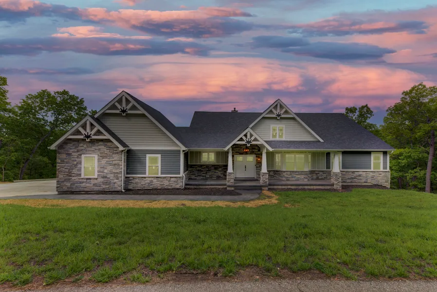 Exceptional quality distinguishes this custom Atrium Ranch with over 5600 SF of Living area, 4 Beds, 3 1/2 Baths and sits on 4 acres with beautiful bluff views. This home has an open floor plan with striking ceilings accented by the can lights, a beautiful stone w/b fireplace with blower insert & large windows. The Kitchen offers GE Profile appliances, large island, stove top with convection oven, microwave, pantry, and desk area. The Dining room has a 4 window bay, all of this for great entertaining. The Primary BR has coffered ceilings, 4 window bay, walk-in closet, bath with Jetted Tub & separate shower The 2 other beds have a Jack & Jill bath & a private bath for the 4th. The basements have 9 ft pour with full bath, half bath & bar rough-ins. Large heated workshop area. The exterior has stone & LP smart siding with a 50 year finish: Roof has architectural shingles: electrical service is 400 amp, plus two 100 amp side panels. Oversized main garage with batt backup opener & more.