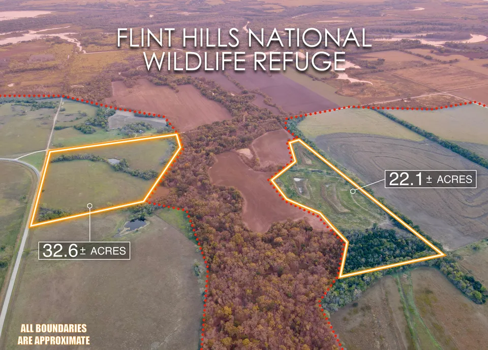 Here is a rare opportunity to own prime hunting and recreation land directly bordering the Flint Hills National Wildlife Refuge on two sides. Located in Coffey County, Kansas, this 55-acre m/l property is comprised of two tracts and features a diverse mix of habitat and water, ideally situated for the serious sportsman or land investor.