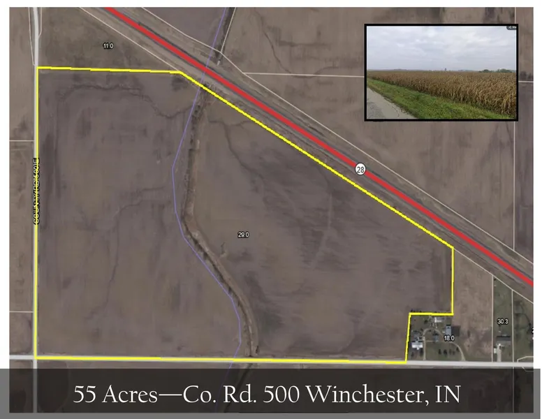 Situated in Jackson Township, Randolph County, Indiana, this 55-acre farm is a fantastic opportunity for farmers looking to expand their operation. With approximately 52 tillable acres, the ground is currently cash rented for the 2025 season, offering immediate income or the option to plan ahead for your own use. The land is predominantly flat, with an open ditch providing excellent drainage across the property. Soil types are well-balanced for a variety of crops, including an estimated 40% Glynwood silt loam (GnB2) with 1-4% slopes, 29% Blount silt loam (BgmA) with 0-2% slopes, 24% Pewamo silty clay loam (Pw) with 0-1% slope, and 7% Eel silt loam (Ee). This farm offers convenient access with road frontage along State Route 28, County Road 500 E, and E 500 N. Whether youre looking to add to your existing acreage or establish a new base of operations, this property provides the space, soil quality, and location to support your goals.