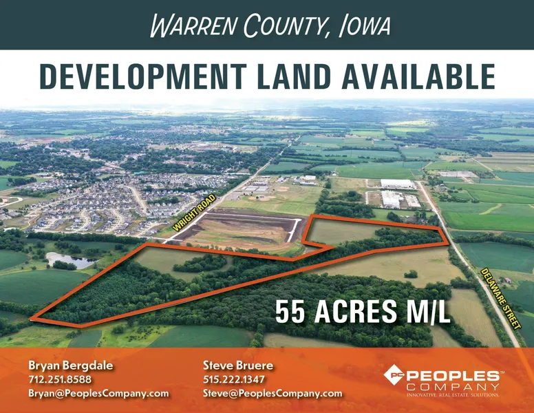 Peoples Company is pleased to offer 55 acres m/l of prime development ground located on the southwest side of Norwalk, Iowa. The property is located next to a residential development area that includes various parks and great neighborhoods. The rolling topography and green space of this property will allow for some attractive walkouts, daylight, and flat lots with a great view. The future sewer line is planned to run through the property from the southeast corner to the northwest corner. Water and electricity are in close proximity to this property making it a high demand development piece. The property borders ground owned by the Norwalk school district and is the future location of a new elementary school. As indicated in the future use map, the northern portion of the property is expected to be Medium Density Residential while the southern portion is slated to be Commercial / Industrial Flex. The property is located on the southwest side of Norwalk in Section 23 of Linn Township in Warren County.