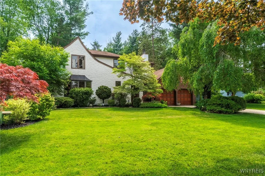 Come and see this *FRESHLY PAINTED* OVER 2,700 sq ft home in Williamsville Schools! Enjoy a park-like, meticulously maintained yard with a spacious deck, stamped patio, trellis, and shed. Entertain in the huge great room addition with wet bar and sliding doors exiting to your picturesque outdoor space. The eat-in kitchen features granite countertops and all appliances, and opens to a large dining room, living room and home office-gleaming hardwood floors throughout. The bright primary suite impresses with cathedral ceilings, skylights, huge windows overlooking the backyard, a massive walk-in closet, and a spa-like bath with dual sinks, two-person whirlpool tub, and shower. Three additional spacious bedrooms and a full bath round out the second floor. Additional storage available in the clean, dry basement. Updates include roof (11 yrs) with heating cables and skylights, two furnaces and AC units (10 & 6 years old). This is the perfect blend of space, location, and serenity.