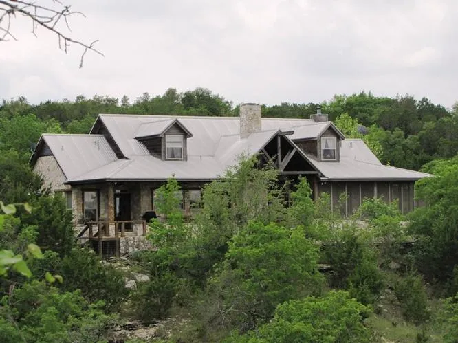Exterior Features: Designed to take advantage of the long views that drop to the creek below, this 3,235 sf custom stone, two story home was built in 1998 and updated in 2004. The stone exterior and architectural cedar logs give this home an unpretentious elegance. A large porch runs the entire length of the back of the home with one end screened in for a retreat off the master bedroom. Tall live oak and cedar trees shade the home and native plants mixed with natural, low maintenance landscaping surround it. A detached and oversized two-car garage tastefully matches the style of the main house.