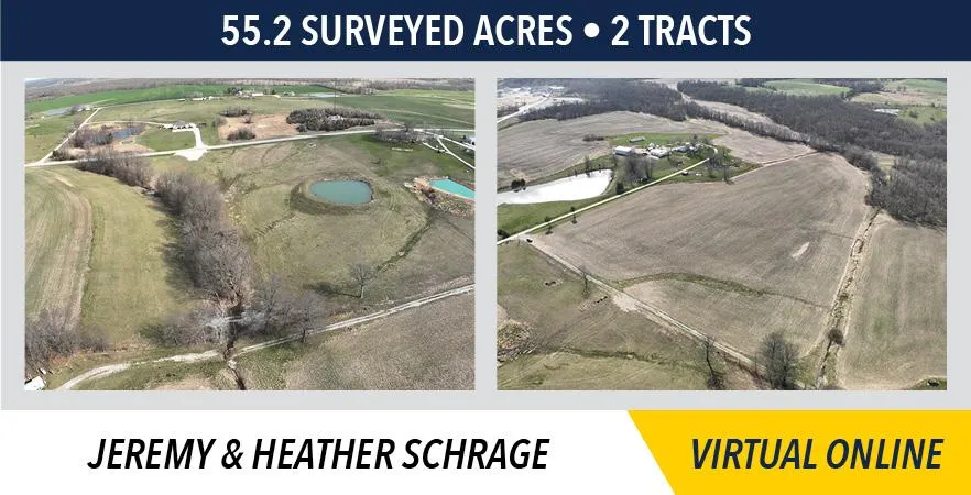 The Schrage farm will be sold on a price per acre based on surveyed acres. Both tracts will be offered through the marketing method of Buyers Choice, whereas the high bidder can elect either of the tracts for their high bid. If the high bidder does not elect both offered tracts, then the remaining tract will continue to be offered Buyers Choice until all tracts have been elected. The tracts will NOT be offered in their entirety at the conclusion of the auction.