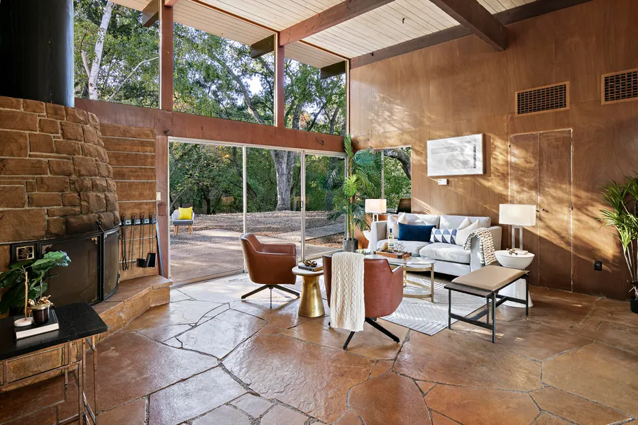 Elements from the original design, like the slightly sunken living room with fireplace and walls of windows, continue to shine in mid-century glory. Adjacent to the main living room is the dining area, which has access to an exterior courtyard where you can enjoy morning coffee as the sun rises. Extravagant stone counters and modern appliances create a well-designed kitchen ready to be utilized by an inspired chef.