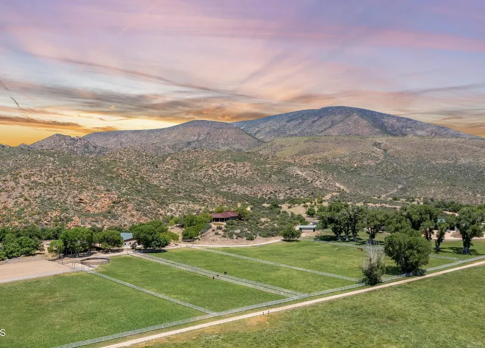 Historic and picturesque Four Cross Ranch is located 20 miles southwest of Prescott and 2 hours from Phoenix. The ranch spans a total of 1,576 deeded acres, with an additional 4,033 acres of BLM and State Land grazing leases, making it ideal for ranching, recreation, and hunting. Perched on a hill, the main residence offers panoramic views of rolling pastures and distant mountains, creating a serene vantage point, along with four more homes for guests and ranch hands. The ranch is efficiently watered by multiple wells and offers top-notch facilities for cattle and horses, including a 14-stall enclosed barn, a two-stall shedrow barn with spacious outdoor runs, and an open-air barn with W panels. It is complete with a tack room, office, round pen, and cutting and roping arenas. Multiple workshops and equipment sheds provide ample space for all ranching activities. The large shop features three-phase electric power.