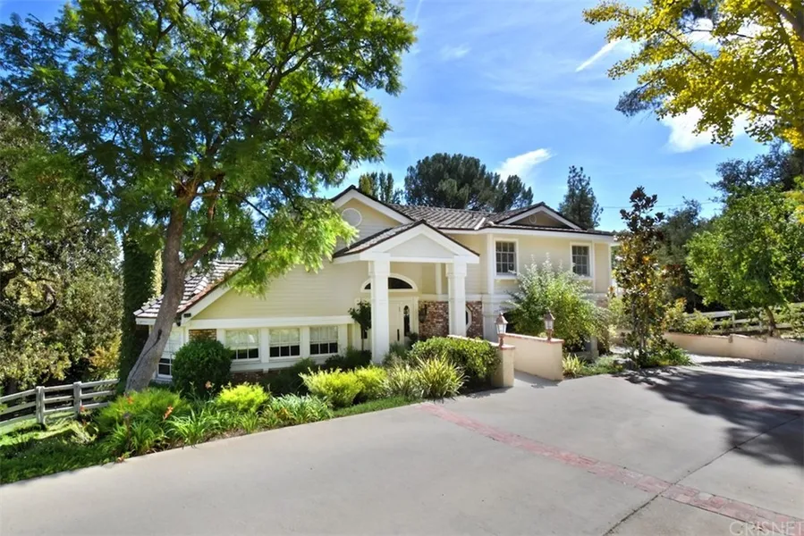 Located in the highly sought after prestigious and gated equestrian community of Hidden Hills. This unique property offers a true sense of tranquility and privacy. The entry of this home has high vaulted beamed ceilings. The flooring of the main living area has Spanish pavers with inlaid wood. The comfortable family room has a floor to ceiling bookcase with an attached ladder and a hand carved mantel that adorns the fireplace. The large living room and dining room have hand carved custom built-in cabinets and French doors that look out to the lush expansive yard. The gourmet cook's kitchen has an oversized marble center island with storage. The kitchen is appointed with granite counters, stainless steel Viking oven/stove, Subzero refrigerator, Fisher/Paykel dishwasher, a built-in banquette, Italian stone paver tile flooring and bountiful storage throughout. There is one bedroom on the main floor and four bedrooms upstairs. The primary en-suite has marble counters, solid wood floors, a large walk-in shower, freestanding tub, a cozy fireplace and two walk-in closets. The large wrap around deck adds indoor to outdoor living space and a spa to relax in. Steps down off the deck bring you to the sparkling pool and waterfall. This park-like yard offers many mature fruit trees as well as twenty-nine evergreen trees giving a sense of privacy. At night, enjoy custom outdoor lighting throughout the front and backyard. There is a three car garage with built-in storage. This home is beautiful as it is, or bring your contractor, this is a great opportunity to build your dream home. We look forward to welcoming you to a truly special home and community within the Las Virgenes School District.