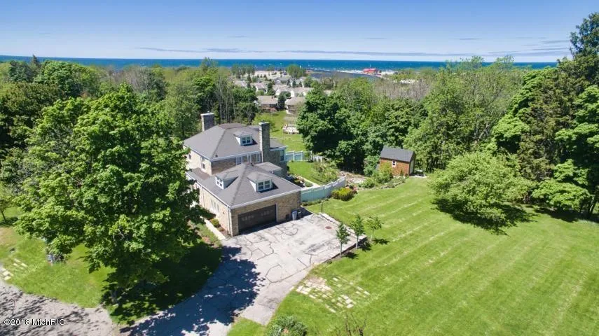 This is Manistee. Historic charm that is tucked back in a park-like setting on 3 acres of privacy, overlooking Lake Michigan. A very rare find here. Built in 1940, this home has only had 3 owners who have loved and cared for it for years. A total of 5 bedrooms and 6.5 bathrooms. The enormous living room offers a marble and alabaster fireplace with a high-efficiency wood-burning insert. And the formal dining room with French doors leads to 2 patios. Beautiful White Oak floors throughout. Upstairs are 4 bedroom suites, each with their own distinctive bathroom. There is also a separate studio apartment, located above the 2+ attached garage, with its own bathroom and a private entrance. An extremely efficient home. And one of the most beautiful homes and locations in Manistee.