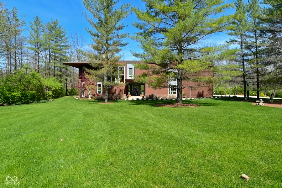 This absolutely exquisite luxury home is truly one-of-a-kind!! With a prime location near everything in the Center Grove area, yet secluded and private, this unique property boasts both convenience and style. From the carefully curated artistic interior design, to the well-maintained acreage with hiking trails, the attention-to-detail, craftsmanship and pride in ownership is unparalleled. Driving onto the property, the home, with its grand Frank Lloyd Wright-inspired-design, is revealed over an expansive lawn with mature trees and beautiful landscaping. Stepping into the home, you are awed by the soaring 22 foot ceilings, gorgeous stone fireplace and floor-to-ceiling windows, with amazing view of the back lawn, private creek and woods. The main floor primary bedroom is a tranquil escape, with attached bathroom featuring double vanities, walk-in shower, garden tub, and huge closet with custom cabinetry. The chef's kitchen is fully-equipped with breakfast bar, granite countertops, custom cabinets and open dining area, and a separate breakfast nook, with curved wall, build-in bench and artistic elements. A large staircase opens up to the second floor, featuring a gallery wall, perfect for displaying artwork, as well as a sitting area, with curved wall - perfect for homework or gaming area. Upstairs has 3 bedrooms (all with large walk-in closets), two full bathrooms, an office/craft room, and large laundry room with sink and built-in storage. Also upstairs is a MASSIVE bonus room with 9 ft ceilings that could easily be converted to an in-law suite! The basement is fully finished and features a large living area with bamboo flooring and stone fireplace, music room, theatre, office, and half bath. The home itself is complete with radiant heat, including the 3 car garage, and too many amenities and upgrades to list - see attachment! The cherry on top is the outdoor space, boasting a 1200 sq ft patio, water feature, creek, and private hiking trails! Truly a hidden gem!!