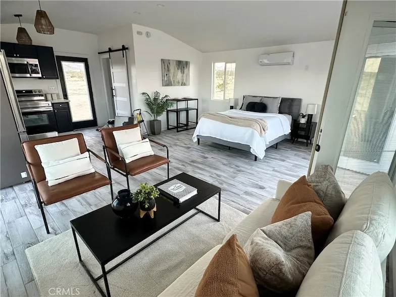 MAJOR PRICE REDUCTION! Welcome to your beautifully renovated desert escape! This home offers the look and feel of new construction, with nearly everything updated to perfection. Highlights include luxury Italian porcelain tile in the bathroom, brand-new Samsung stainless steel kitchen appliances, new cabinetry, quartz countertops, stacked washer/dryer, and modern fixtures throughout. From the recessed lighting to the fresh tile flooring, windows, doors, and new/updated electrical (split AC/heat), plumbing (tankless water heater), drywall and exterior siding basically everything is completely new!Nestled on 5 expansive acres in a growing area beloved by celebrities and artists alike, this property offers a serene retreat. A top Airbnb destination just minutes from Joshua Tree National Park, the world-renowned healing Integratron, and amazing restaurants like La Copine, Giant Rock, and Pappy & Harriet's, makes it an ideal location for both relaxation and adventure. Plus, with Big Bear s snow-capped mountains an hour away and the excitement of King of the Hammers nearby, there s never a shortage of things to do.Located just 2 miles down the well-maintained Bodick Road, past Kickapoo, this cabin is the best-priced, move-in-ready property on the market tens of thousands below similar homes! The expansive deck is perfect for enjoying morning coffee, evening wine, or hosting friends and neighbors. With space to sleep up to four, it's an ideal spot for weekend getaways. Enjoy starlit skies, bonfires, and complete tranquility your desert oasis awaits!Fully furnished purchase option available..