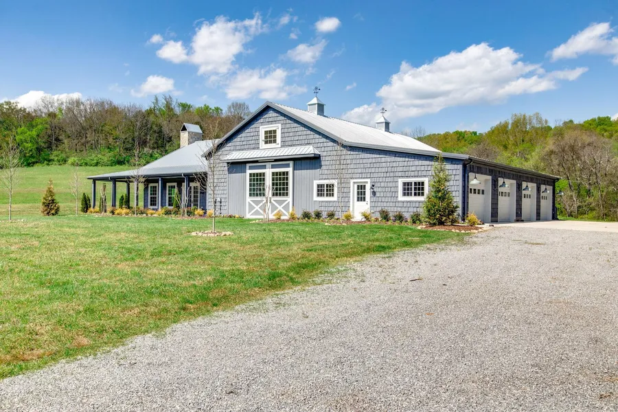 Tract 1: 30 +/- Acres & Impressive and 2 year old barndominium built by locally renowned Will Andrews. This stunning barndominium features a four stall horse barn with tack room, feed room, and separate wash stall. There is an oversized 4 car garage. Both sections of the barndominium are heated and cooled separately. This incredible structure features ample storage above horse stalls. The owner has gone above and beyond with upgrades, including insulating the metal roof with foam insulation. No detail was overlooked, and no expense was spared. The horse stalls have never housed any animals. Stepping into the opposite side of this amazing barn is a farmhouse style home that is 1909 sq ft. The home contains 2 full bedrooms and 2 full bathrooms with large walk in showers and separate laundry room area. The well-appointed living quarters boasts an oversized 24x34 living room, open to a gorgeous farmhouse style kitchen with walls of windows and doors, stacked stone fireplace, and vaulted ceilings. The wraparound porch shows you 360 degree views of the gorgeous countryside of Leipers Fork, TN.