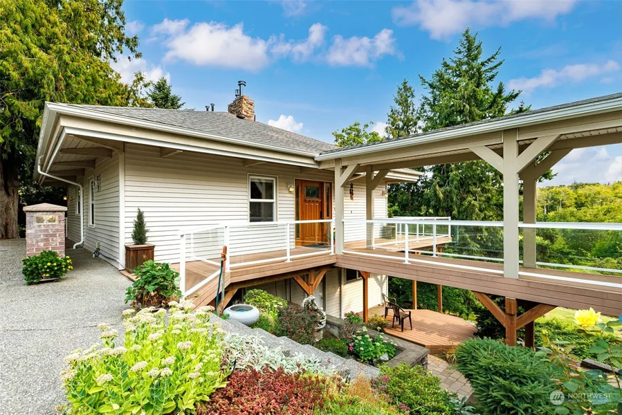 Impeccably maintained home on 5.11-acres in the Meridian School District. Enter the bright living space kept cozy by a gas fireplace and enjoy the beautiful territorial views accented by up-lighting under T&G ceilings. Adjoining kitchen offers ample storage space, breakfast bar, S/S appliances, dining area and entry point to the newer Timbertech deck: perfect for enjoying nature with your company. Main level also offers primary bedroom with bright ensuite and large linen closet PLUS a work-from-home office. Large lower level features a family room w/ wood stove, surround sound, Maple floors & access to the beautiful, mature Japanese stye gardens, fruit trees and a playhouse. 3-car detached garage has a bonus shop space in the lower level.