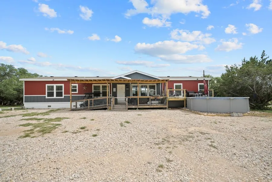 Welcome to your new oasis in the Hill Country! This meticulously maintained 4-bedroom, 2-bathroom manufactured home sits on a sprawling 2.2-acre tract adorned with majestic oak trees, offering stunning views and ample space to relax and entertain. Inside, you'll find an inviting open layout that flows seamlessly from room to room. The heart of this home is the expansive kitchen, complete with an island that's perfect for meal preparation and casual dining. The spacious primary suite offers a generous en-suite, creating a private haven for relaxation. Step outside to enjoy the newly added pool or unwind on the covered porch-both perfect for cooling off on warm Texas days. Additional features include a detached shed for extra storage or a workshop and a vast yard shaded by mature trees, providing a tranquil setting for outdoor activities. Located in a warm, welcoming neighborhood, this property offers both the tranquility of country living and the convenience of easy access to local amenities. It's the ideal home for anyone seeking a move-in ready residence with abundant space for future possibilities.