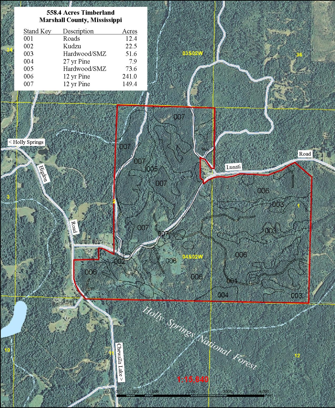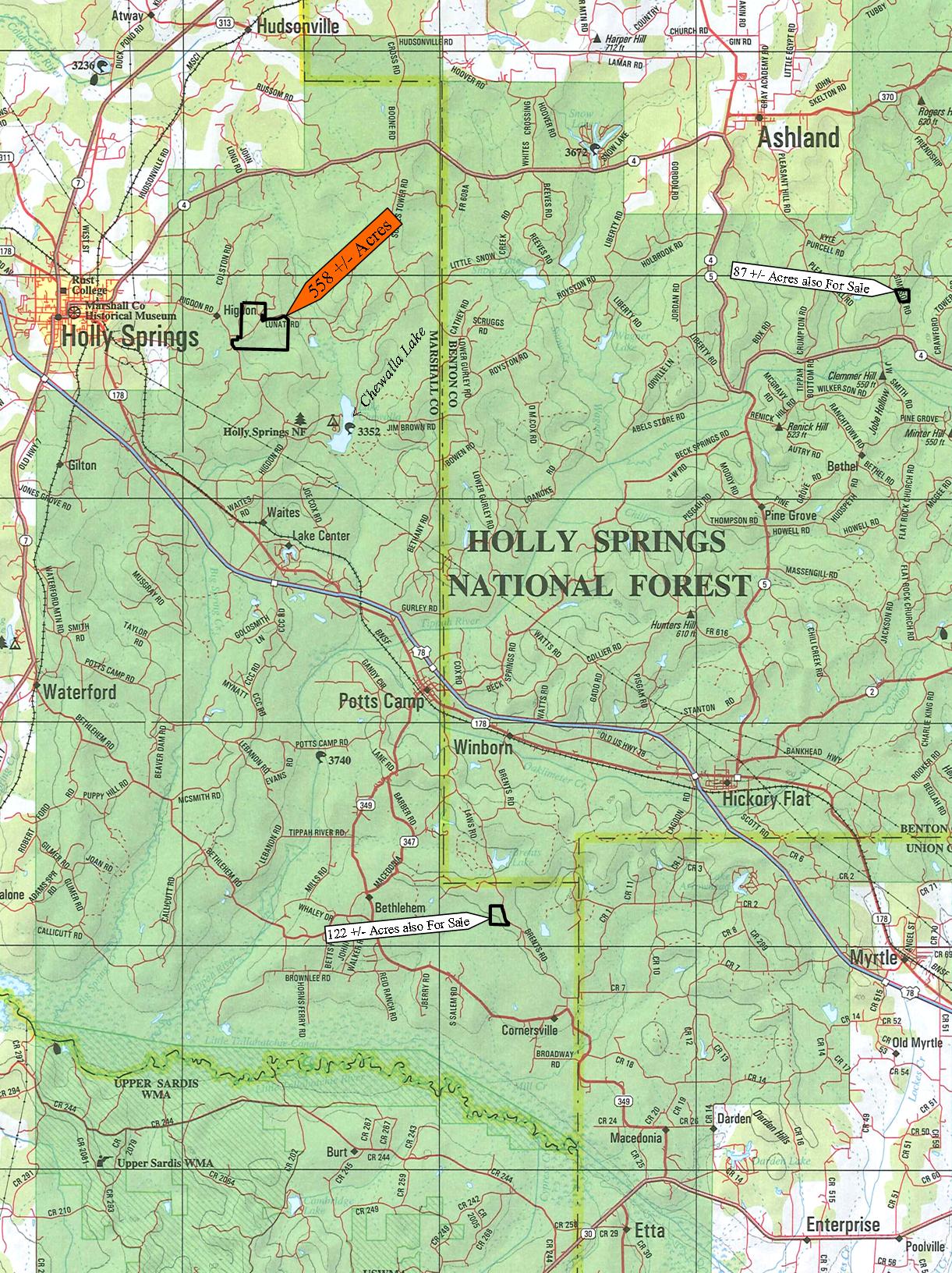 Professionally established pine plantation with 1.5 miles of paved road frontage. Outstanding deer & turkey hunting adjoining a large block of the Holly Springs National Forest surrounding Chewalla Lake.
