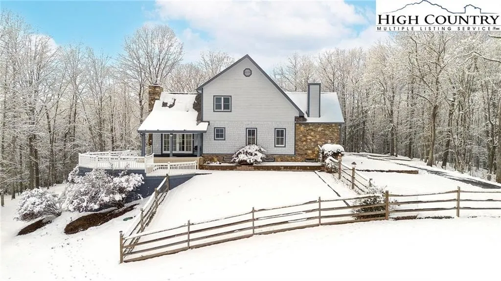 Live perched at the top of approximately 21.7 acres, with access to the historic New River within two minutes and the charming town of West Jefferson only a short 20-minute drive. This mountain retreat offers sweeping long-range panoramic views, pasture, and wooded acreage to explore. Privately positioned on a knoll, the home blends quality craftsmanship, serenity, and practical living in a setting defined by natural beauty. Expansive windows frame the surrounding mountain landscape while drawing in abundant natural light. Nine-foot ceilings on both levels, crown molding, and rich wood flooring create a timeless and inviting interior. The thoughtfully designed floor plan features 4 bedrooms and 4.5 baths, with main-level living that includes the primary suite, laundry, and the guest half bath. The foyer leads to the heart of the home, where the kitchen anchors the living spaces with seamless flow. Newly installed granite countertops and a new dishwasher complement the existing stainless steel appliances, including a gas cooktop, wall oven, built-in microwave, and wine cooler. With abundant cabinetry and generous workspace, this modern kitchen is ideal for both daily living and entertaining. The sunken living room is rich in rustic charm, featuring wood accents, a wood-burning fireplace, and large windows showcasing expansive views. French doors lead to an expansive patio with a covered porch and open decks, seamlessly blending indoor and outdoor living with mountain tops as the focal point. The primary suite provides a private retreat with an ensuite bath offering double vanities, a walk-in closet, soaking tub, tiled shower, and a private water closet. An informal dining area offers additional counter space and storage, well-suited for serving and entertaining, while a formal dining room provides an elegant setting for special gatherings. A sitting room completes the main level. The upper level includes a spacious loft bedroom, two full baths, a walk-in storage closet, and two additional guest bedrooms, all accented by antique solid wood doors that add distinctive character. The finished lower level adds flexibility with additional living space, including a kitchenette, full bath, and bonus room—ideal for guests, recreation, or extended living. A two-car garage with an adjacent workshop connects to an additional garage suitable for multiple UTVs, along with a large hobby room. Outdoor living spaces include a covered porch and deck designed to take full advantage of the sweeping mountain views. Additional features include ample parking, a four-bay outbuilding, and extensive recreational space. The home is staged; personal property conveys only as outlined in the listing documents. Staged furnishings may be purchased separately through the staging company. Due to a change in personal circumstances, the sellers have chosen not to relocate.