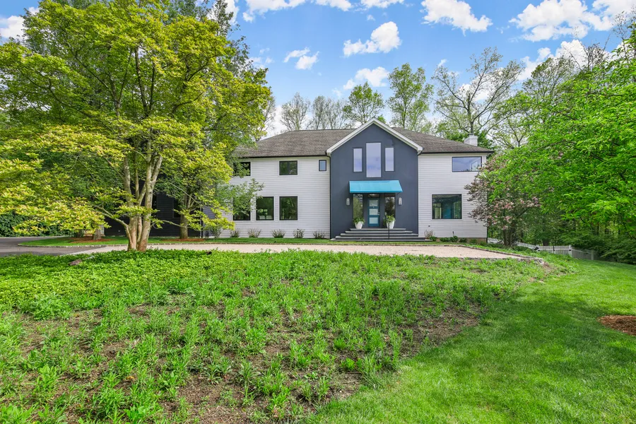Set off a wide private lane bordered by truly magnificent grounds of adjoining great estates, this transformed five bedroom colonial is now a sleek and uniquely private retreat. An open first floor plan with oversized windows and doors, along with contemporary interior accents, integrates the stunning grounds with dramatic interior spaces. Generous scale in all the rooms allows for flexible usage and easy flow. A double height entry with vaulted ceiling is flanked by a dining room and large living room with fireplace, with a stunning two-story solarium beyond. A wide deck, framed with sculptural trunks of intricately twined hanging wisteria vines, extends from inside, allowing for plein-air entertaining. The heart of the house is centered around the masterfully-designed chef's kitch with industry-appropriate appliances, antimicrobial copper countertops and an end-cut butcher block island for prep. Cooking can be theater with room for two or more chefs and seating for seven around one of the islands. Accessible storage both in cupboards and shelving balances display areas with conventional organization. The family room with an eat-in area are natural extensions of this lively space as are the screened porch and terrace opening on to a salt water pool with waterfall and spa. Upstairs there are two primary suites on opposite ends of the house, both with sitting rooms, and one with fireplace and wide balcony with private views year 'round. Three large bedrooms and a small office or spare room are all separately situated on this floor. A walk-out basement, mud room and separate laundry with dog shower are a few of many extras. Living large costs less here with geo-thermal heating and cooling as the predominant source of energy. Discrete solar panels generate nominal electric bills, including daily charging of two cars in the three-bay garage. Enjoy a perfect serenity rarely found in Greenwich...while being just minutes from town.