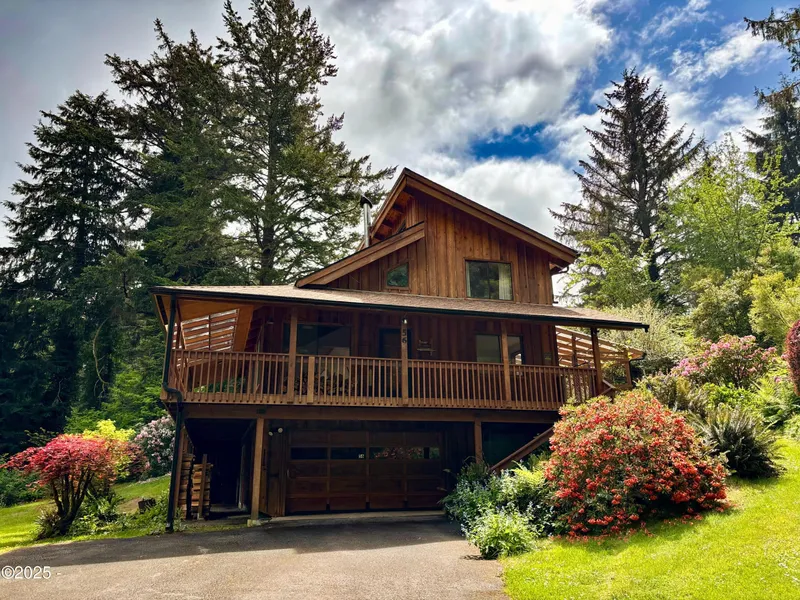 Welcome to your very own coastal retreat! Tucked away on 3.78 acres of serene, wooded beauty, this special property offers the perfect blend of privacy & space. This beautifully designed 3-bedroom, 2-bathroom home combines mid-century modern aesthetics with rustic elegance. The open-concept living space, soaring vaulted wooden ceilings, two cozy wood stoves, and expansive windows and skylights fill the home with natural light. Spacious kitchen, complete with stainless steel appliances, is perfect for cooking and gathering. The unique layout of the home offers space flexibility and a multitude of choices for home setup. Main floor bed, bath & laundry room, elevated living room, lofted family room (owner used as large primary suite) two lower level bedrooms and bathroom. Updated finished