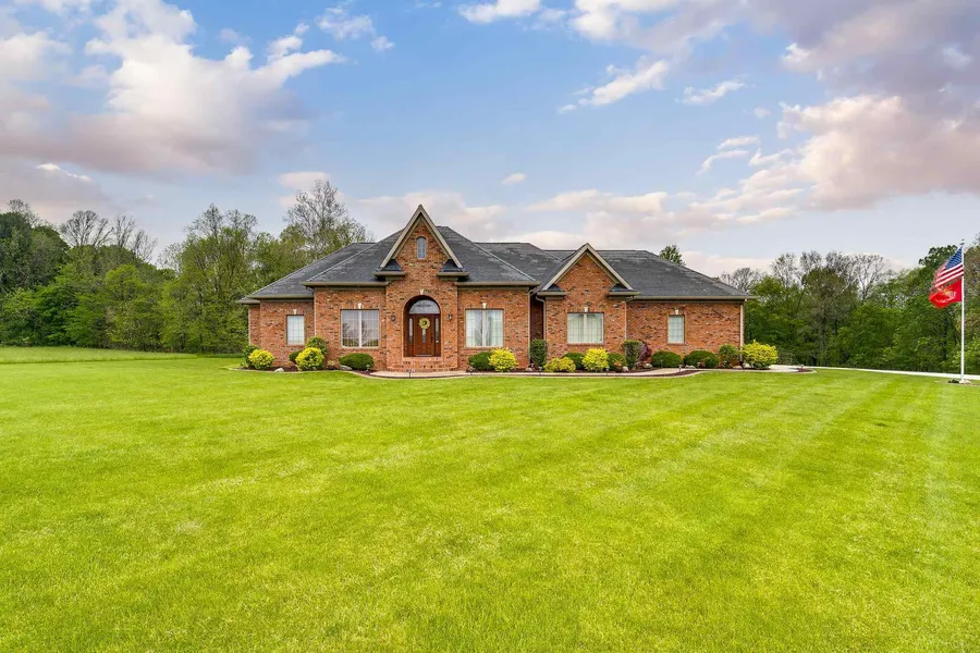 A rare, once in a lifetime opportunity on over 16 acres. This solid construction all-brick home is conveniently located close to the schools. Entertain in your own gourmet kitchen with granite counters throughout, 11 ft ceilings, Brazilian cherry floors. The kitchen walks out to a deck that includes a custom gazebo and hot tub. The sunroom off the kitchen boasts privacy galore all while you watch the local wildlife along your tree-lined back yard. This dream home has over 5600 square feet. There are 4+ bedrooms; 2 en-suite bedrooms on the main level. The extra-large spa-like Master bedroom offers a custom walk in closest, and a jacuzzi tub, tile shower, and double latrines. The full basement offers 2 additional bedrooms with room to frame in more. 6 acres are leased out farmland that brings in an additional income several times a year during harvest. The 6 acres are available to be subdivided.