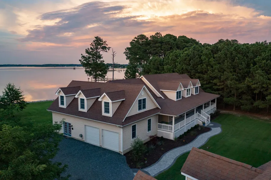 Surrounded by seven acres of panoramic waterfront property, this spacious, beautifully appointed home of inviting Coastal Country Farmhouse personality awaits as your next retreat on this naturally protected cove on Marylands Eastern Shore. Arrive home to open tree-dotted greenspace, beautiful riprapped Brannock Bay shoreline, and a sprawling porch-wrapped entry. Inside, explore 5574 square feet of coastal-perfect rooms with casual hues, Brazilian Cherry floors, endless windows, and vaulted ceilings. In the gourmet kitchen, create meals for gathering friends using beveled granite countertops and high-end appliances. Custom-built cabinets and a walk-in pantry display and tuck away wares. Look over the double-storied living room, breakfast nook, and glimpse evening boats, Ospreys and Eagles while preparing the days catch. From the inviting rear porch, grill, pour glasses of cheer, and linger past sunset, or head out to your private dock to check your crab pots and launch your kayaks, paddleboards, or weekend boating adventures. At days end, complete online tasks and wind down with a read from the bookshelf-clad library, or head to the expansive bonus room to play games or watch a movie. Five spacious bedrooms and three and half baths are tranquil retreats, including a first-floor primary suite complete with porch access through French glider doors, walk-in closet, soaking tub, and double vanity. While on tour, visit the fully independent carriage house, look forward to tinkering with hobbies in the workshop, or drive into town with a vehicle ready in the two-car garage. Moments from local crab houses, and just 15 minutes from downtown Cambridge, your breezy Eastern Shore lifestyle awaits near the Blackwater National Wildlife Refuge, favorite shops, eateries, annual festivals, golf, and more.