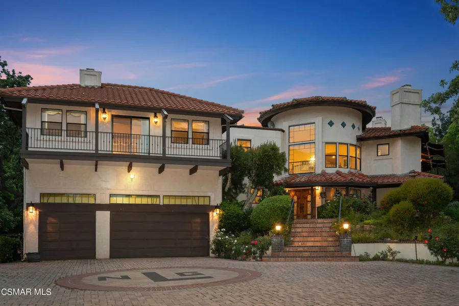 Extraordinary North Ranch estate on extra large lot! The private wrought iron gate leads to a brick-pavered driveway, which opens to a stunning large circular motor court. The extraordinary park-like grounds surround the house with mature trees, shrubs, lawns and a natural creek. Enter the house through custom wood double doors into an elegant two-story foyer with hardwood flooring. This opens to a formal living room with sliding doors to a private patio as well as a custom stone fireplace. The chef's kitchen features granite counters, custom wood cabinetry, Thermador stainless steel appliances and a Sub-Zero refrigerator, with a built-in desk and a sunny breakfast nook overlooking the backyard. The adjacent formal dining room features sliding doors to the outside patio. The oversized family room features a brick fireplace and wet bar and overlooks the beautiful gardens. There is a large indoor laundry room with a sink, conveniently located next to the kitchen. The stunning circular staircase leads you upstairs to a luxurious primary suite. The bedroom features a separate sitting area with a double-sided fireplace, walk-in closet and two private balconies. The bathroom features double sinks, an oversized spa tub and a separate shower and WC. The remaining four bedrooms are in a separate wing of the home, each with access to a full ensuite bathroom and their own private balconies. The serene, private setting of the home, in a natural environment, features unique sitting areas, an outdoor kitchen with built in BBQ, garden planter boxes, numerous fruit trees, oak trees, dozens of blooming roses, a 16-station irrigation system, an above ground spa sheltered with an awning, ADU possibilities, all surrounded by gorgeous landscaping and mountain views. The interior of the home was recently painted and features Milgard windows and custom window treatments throughout. There is a direct access three-car garage with high ceilings and ample storage, a central vacuum system, fire sprinklers throughout, alarm system, all house intercom and dual zone HVAC. Ideally located in close proximity to North Ranch Country Club, restaurants, shopping, hiking and so much more!!
