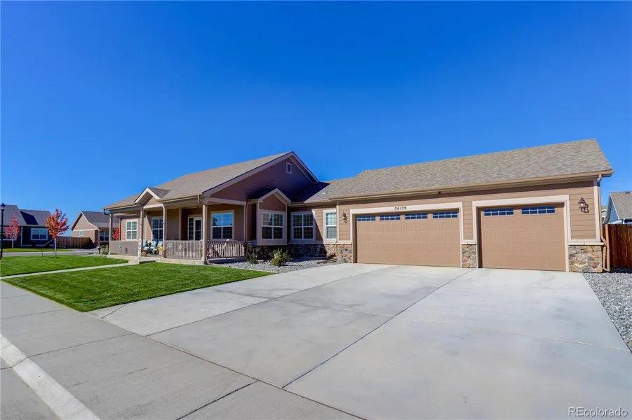 Beautiful ranch-style home on a large corner lot in Blackstone Ranch! Newly completed in October 2021 with multiple upgrades, your new home features a spacious floorplan with 9 ft ceilings, stylish neutral dcor, and a roomy kitchen complete with soft-close maple cabinets, 42" upper cabinets, stainless-steel appliances with gas range, and granite countertops. Upgraded luxury vinyl plank flooring extends seamlessly throughout the kitchen, dining room, living room, and foyer. Everything you need is on the main-level including a large laundry / mud room and a primary suite complete with 5-piece bath, upgraded tile shower and soaking tub surround, and walk-in closet. Largest floorplan in the neighborhood with generous living space, a full basement, and 3,950 total sq. ft. Abundant storage and parking with an oversized three-car garage (complete with insulation and drywall) and an expansive driveway. Enjoy your morning coffee on the impressive covered front porch, and a relaxing evening in the spacious backyard. Convenient location near amenities, rec center, schools, and community park. Easy commute to Buckley AFB, Anschutz Medical Campus, Southlands Mall, Aurora, and Denver International Airport. Secure your new home in Blackstone Ranch today, welcome home! **220v outlet / electric option also available behind gas range **Garage has been drywalled and convenient storage shelving / organizing systems installed **Custom window well covers & radon mitigation system installed **New cabinet hardware and blinds / window coverings installed throughout the main level.