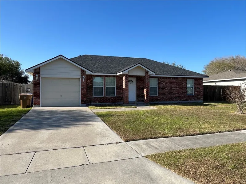 Three bedroom two bath brick home tiled throughout with one car garage. Front door opens up to the living room and leads you into the kitchen with lots of countertop space, eat in breakfast bar, double basin sink, separate pantry, casual dining area with bay windows, and access to fenced in backyard. Washer and dryer connections in a separate room off the kitchen leads to the garage. Two bedrooms overlook the front yard and correspond to a hall bath with tub shower combination. Primary bedroom tucked away in the back of the house overlooks the backyard and offers a tub shower combination, walk in closet, and ceiling fan.