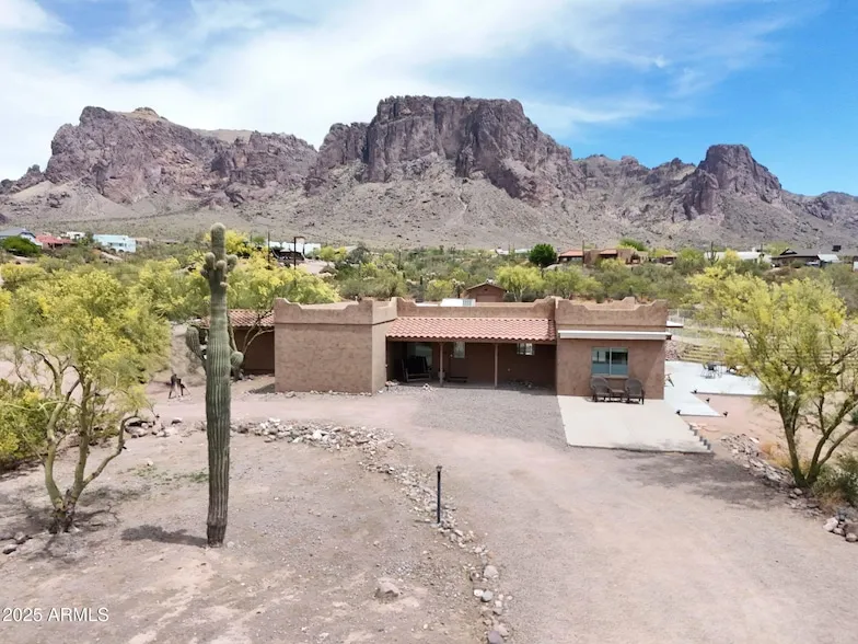 Welcome to your private desert oasis with unparalleled views of Superstition Mountain! Nestled near the western side of Flat Iron, this unique property spans 3 adjacent 1-acre parcels, with the home centrally located on the middle lot. Tucked away at the end of a tranquil street surrounded by horse properties and custom homes, this retreat offers serenity and privacy without the restrictions of an HOA. The main residence features 2 bedrooms and 2 baths, complemented by two studio suites accessible via separate exterior entrances. These versatile suites are perfect for in-law suites, guests, or as income-generating short-term rentals, showcasing flexibility and convenience. Outside, immerse yourself in nature's beauty from the pool, spa, or patios, looking up at Superstition Mountain Witness coyote, deer, javelina, road runners, quail, and more in this natural desert setting. This property offers multiple unique opportunities. The additional parcels can be separated and built upon; the eastern acre is ideal for horses. The house itself can serve as a residence, income property, or combination of both.