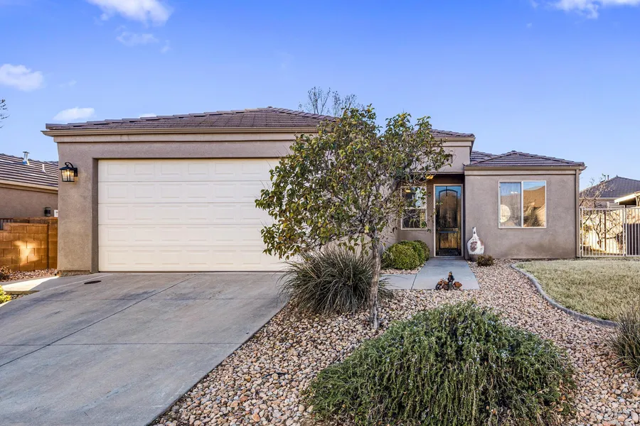 Experience desert living at its finest! Nestled at the foot of Snow Canyon State Park, this captivating home boasts breathtaking Red Mountain views. Inside, discover elegant wide-plank flooring, vaulted ceilings, and a cozy rock gas fireplace. Custom cabinets and stylish tile accents enhance the home's charm. Enjoy a private, fenced backyard and meticulously landscaped surroundings. HOA benefits include cable, pest control, and park access, ensuring a carefree lifestyle.