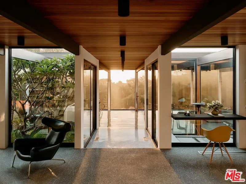 Introducing The Glass House by John Klopf, AIA, the midcentury modern masterwork of Malibu Park. Thoughtfully conceived within the natural landform on over half an acre, this newly constructed single-level residence is beautifully elevated above Zuma, offering blue-hued views of the Pacific Ocean and the earth-toned coastal mountains. An artfully composed blend of floor-to-ceiling glass, warm woods, and handsome, hand-poured terrazzo creates a paradisal, livable art piece. Beyond the saltwater pool and manicured yard, an outdoor sanctuary of impeccably curated landscaping unfolds, with a meandering pathway leading to a fire pit, sculpture garden, and pickleball court. Completing the estate is a secondary A-frame structure, offering versatile space for an office or gym. The Glass House provides a singular living experience, where every element is masterfully designed to inspire and elevate.