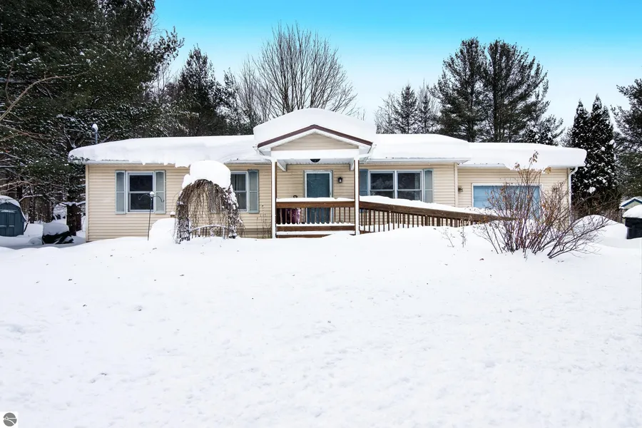 Charming Ranch home tucked in the woods in Williamsburg. This home has the best of both worlds a peaceful setting to come home to and just a short commute into Traverse City. Home features an open kitchen, living and dining area with laminate flooring throughout, making the most of the space. Kitchen has lovely grantite counters and easy access to the rear deck ideal for bbq'ing. Greet your guest or sit out and watch the birds on the covered front porch. The home has a full unfinished basement for expansion room. Attached 1 car garage, 2 garden sheds are great for storage. Fenched garden area.