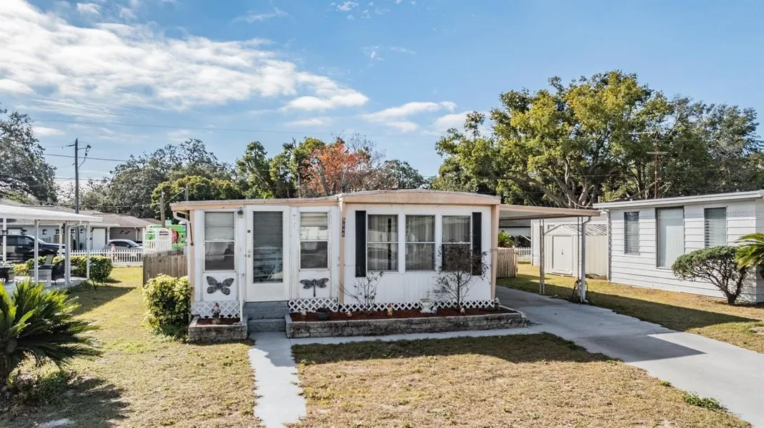 Title in place / Own the land! This 1970 2/1 mobile home has Hurricane straps, a security system along with a long driveway and carport area for tandem parking. NO FLOOD - LOW TAXES - OPTIONAL HOA ($35.00 A YEAR). April 2024 all new planks, plywood and bracing were installed (value: $12,000) in the kitchen, hallway, bedroom 2 area. Gutters and downspouts are attached. This dwelling boasts of large rooms and a fenced backyard next to an alleyway. Enter into a 27 x 10 family room with 3 large windows and a wall to hold an enormous television. The kitchen is shared with the dining area in the front of the dwelling allowing the view of the front yard. An exterior raised flower bed box is next to the front entrance. A double sink is under a pass through window into the family room. Roof membrane is in good shape. HVAC (3.0 ton) and thermostat are 2 years old with all new duct work just installed under the trailer. The electrical panel was upgraded in 1991. A spacious walk-in closet in the first bedroom includes an extended area great for another bed, office, sitting area, etc. A large shower bathroom will not disappoint with a new toilet. Down the hall is a second bedroom with a regular closet and a complete wall unit bearing 5 doors and 6 drawers. Plenty of storage for any clothes. There is a storage shed bearing a washer/dryer hookup and electricity just out the back door. The hot water tank is housed within a storage shed within the fenced yard. The second storage shed also has electricity and lots of shelves. A new plumbing drain pipe to the septic tank was professionally installed. Enjoy the optional clubhouse ($35.00 annually) for coffee or having a party. Take advantage of nearby shopping & restaurants. The Gulf of America, MacDill Air Force Base, hospitals, the new VA Outpatient hospital, the forthcoming H. Lee Moffitt Cancer Center and Research Institute (with a world-class expansion campus in Pasco County within a few years), beaches, and numerous other attractions are convenient. Tampa and St. Pete Clearwater Airports are appx 30 minutes away, granting easy access to anywhere in central Florida. Your playground awaits!