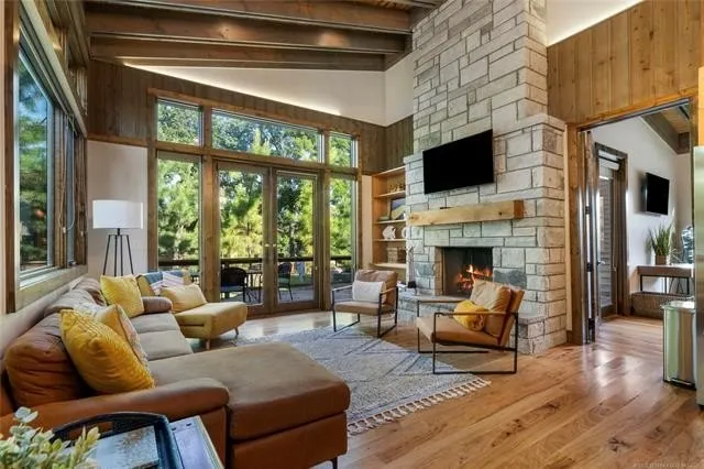 Step inside and you’ll find an open-concept living space anchored by a wood-burning fireplace with a mounted TV above—ideal for cozy nights or game-day gatherings. The kitchen flows seamlessly into the living and dining areas, creating the perfect setting for entertaining.