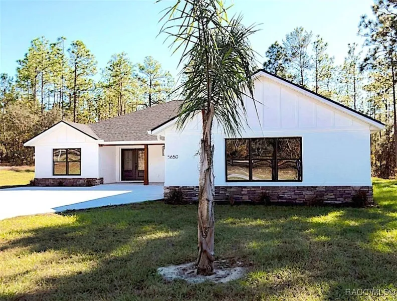 Escape the ordinary in this brand new 2025 custom-built home located in the prestigious Pine Ridge Estates. While other homes offer a standard layout, this ranch-style residence was designed for an elevated lifestyle. Nestled on a sprawling one-acre lot, the property features an extended concrete driveway leading to a three-car side-entry garage. This garage includes two bays for vehicles and a versatile third bay with a side entrance, perfect for housing your recreational toys or lawn equipment. Approaching the home you will encounter a brick paver covered front porch, an ideal spot for relaxing. Step inside and be greeted by a massive, open-concept floor plan that seamlessly blends all primary living spaces. The interior is enhanced with laminate wood flooring, abundant recessed lighting, and designer fans. Sliding doors open to a spacious brick paver covered lanai, perfect for entertaining or enjoying quiet evenings outdoors. The gourmet kitchen is a chef's dream, boasting gleaming granite countertops, pristine white shaker cabinets, stainless steel appliances, and a walk-in butler's pantry for all your storage and meal prep needs. Retreat to the luxurious owner's suite, which offers a spacious walk-in closet and a spa-like ensuite with dual sinks set in granite countertops and a stunning glass-enclosed, tiled shower. Two additional generously sized bedrooms, one with a walk-in closet and the other highlights tranquil backyard views, providing comfort and privacy. This quality-built home offers the perfect blend of comfort and style, inviting you to enjoy the best of Pine Ridge and the Florida lifestyle.