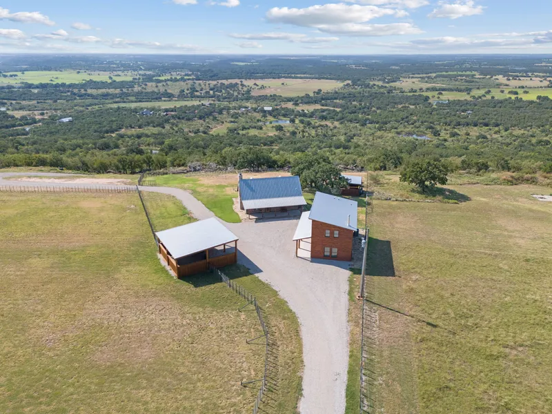 Nestled just 40 minutes from Fort Worth, this stunning 42-acre ag exempt property offers a truly rare and exceptional experience, combining breathtaking panoramic views with luxurious living and diverse natural beauty. This is a unique opportunity to own a piece of the Hill Country's magic, where the rolling topography and elevations reaching 1,120 feet create a majestic southern vista that is simply unmatched in this region. From the wrap-around covered porches of both homes, prepare to be mesmerized by a jaw-dropping panorama that stretches across at least four counties: Palo Pinto, Parker, Hood, and Erath. This isn't just a view; it's a constant, awe-inspiring spectacle that serves as the backdrop to your everyday life.