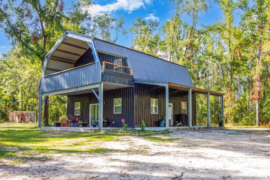 2023 barndominium in Live Oak, FL for sale on 10 wooded acres!Follow the winding drive back to this 3-bedroom 2.5 bath home thats practically new! Downstairs the main living area is open & bright with sliders opening to a covered porch and views of the private yard. Off the kitchen is a huge laundry room with half bath. The 3rdbedroom could also be an office space. Upstairs are 2 bedrooms and 2 baths. The master bedroom has walk in closet and ensuite bath with tile shower. Enjoy the balcony off the master bedroom with more views of the natural woods.