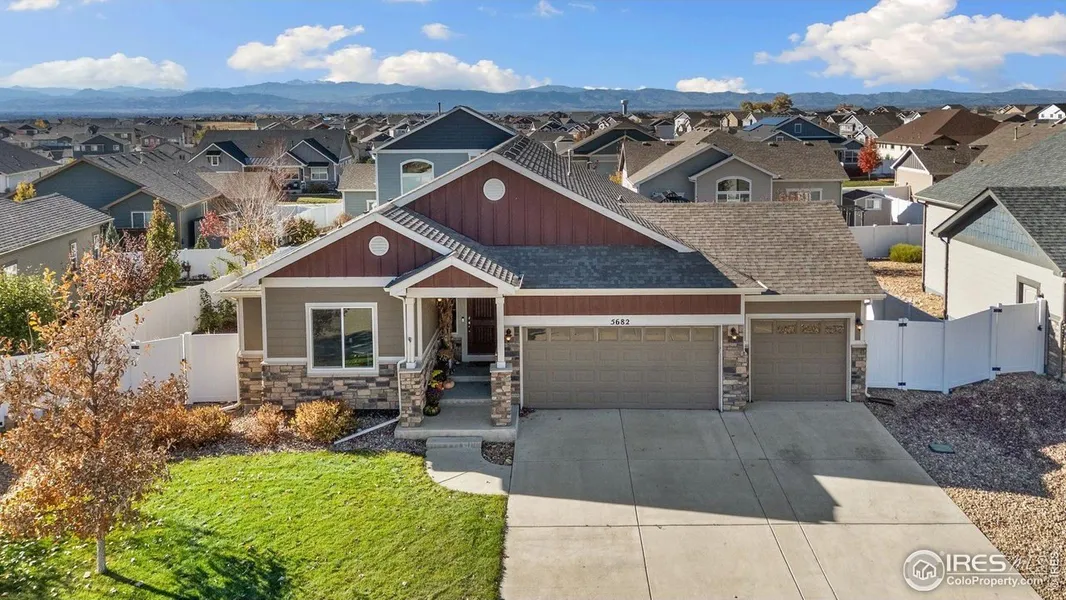 Gorgeous 5 bedroom ranch home with stunning MOUNTAIN VIEWS!! This home was built by Saint Aubyn and has been lovingly maintained. You'll immediately appreciate the quality of the home, abundant natural light, wood floors, NEW carpet, and open floor plan. The expansive kitchen island, gas range, ample storage, and granite counters make this kitchen a dream come true. The back yard is ready for enjoyment with fresh mulch, a convenient dog run and stunning mountain views. Primary bedroom is a true retreat with more vaulted ceilings, soaker tub, dual sinks, and spacious walk-in closet with custom shelving. Basement is fully finished and ready to enjoy! 2 additional bedrooms downstairs plus the 3rd bathroom and space for lounging, crafting, exercising, etc. Neighborhood has a bike park, trails, playground, and quick I-25 access!