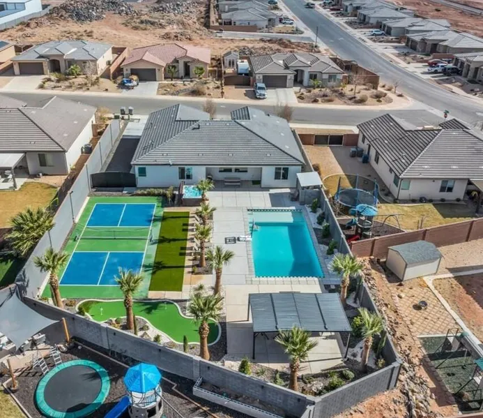 This beautiful 4-bedroom, 3-bathroom property is situated on a spacious third of an acre lot with no HOA. The backyard is an entertainer's paradise! Sparkling saltwater pool with an electric cover, lighted pickleball court, putting green, a cozy fire pit, Ramada, and artificial turf for low maintenance. Enjoy the layout deck, surround sound system throughout the backyard and house, lots of landscape lighting, extra hose faucets, gas fire pit, additional electrical outlets, and a relaxing jacuzzi. Inside, you'll find a prewired audio system and surveillance cameras in the front and back for peace of mind. The home boasts a smart thermostat, efficient HVAC system, an additional mini split in the front bedroom, and water leak detectors throughout. Every room is equipped with TV hookups, while electric blinds add a convenient feature to most living spaces. The primary en- suite includes a spacious walk-in closet, walk-in shower and separate bathtub. The home features LVP wood flooring throughout, modern white cabinets, and stainless-steel appliances. Additionally, there is a reverse osmosis system and soft water loop. Epoxy-coated garage complete with custom cabinets, overhead storage, and a 50-amp Tesla charger. Exterior conveniences include a Ring doorbell, Schlage lock with multiple code capabilities, an exterior garage keypad, and an RV gate with RV parking. This fully landscaped property, dazzled with amenities and wrapped in mature palm trees, is the perfect place to call home!